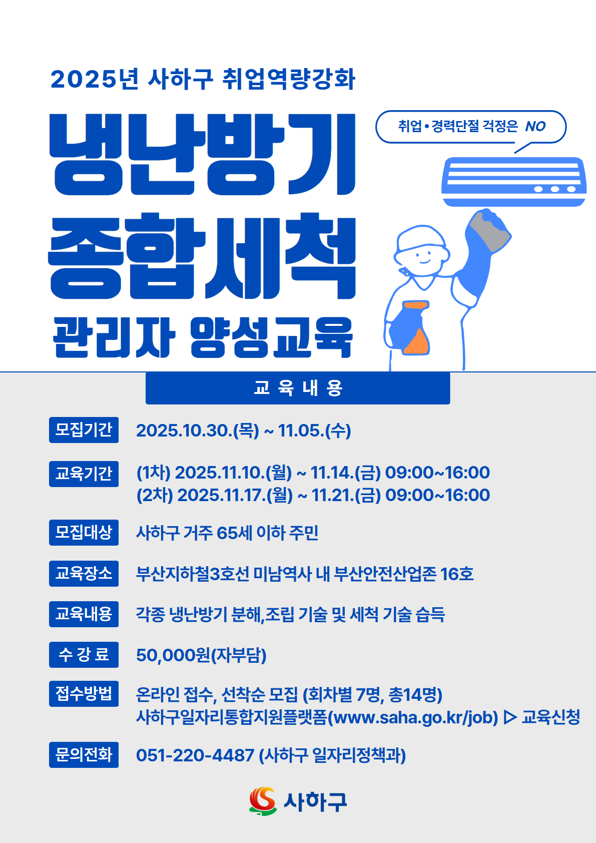 2. 구직등록(로그인)> 본인인증> 메인페이지 팝업창 또는 교육신청 클릭> (냉·난방기 종합세척 관리자 양성교육 과정)> 수강신청 클릭